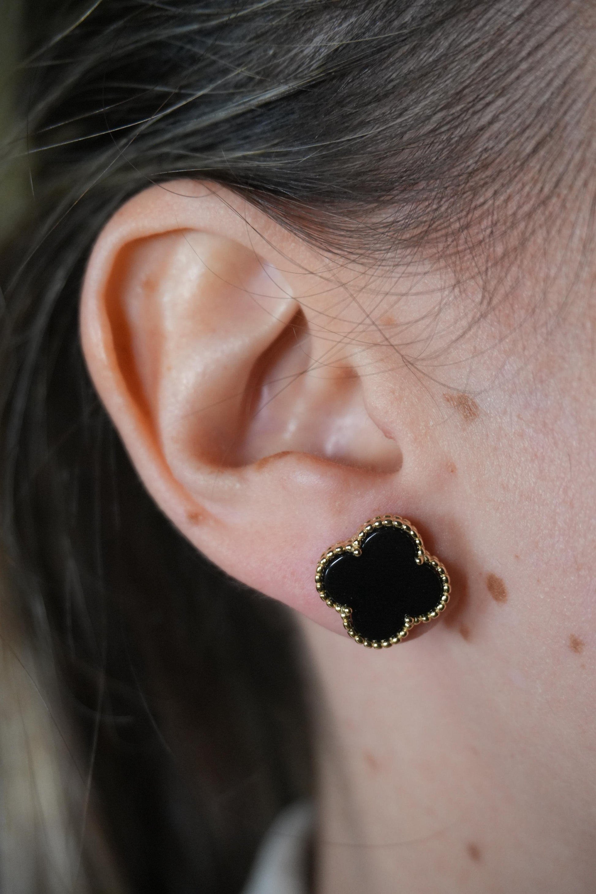 Aretes de plata bañado en Oro amarillo de trebol con Onix natural